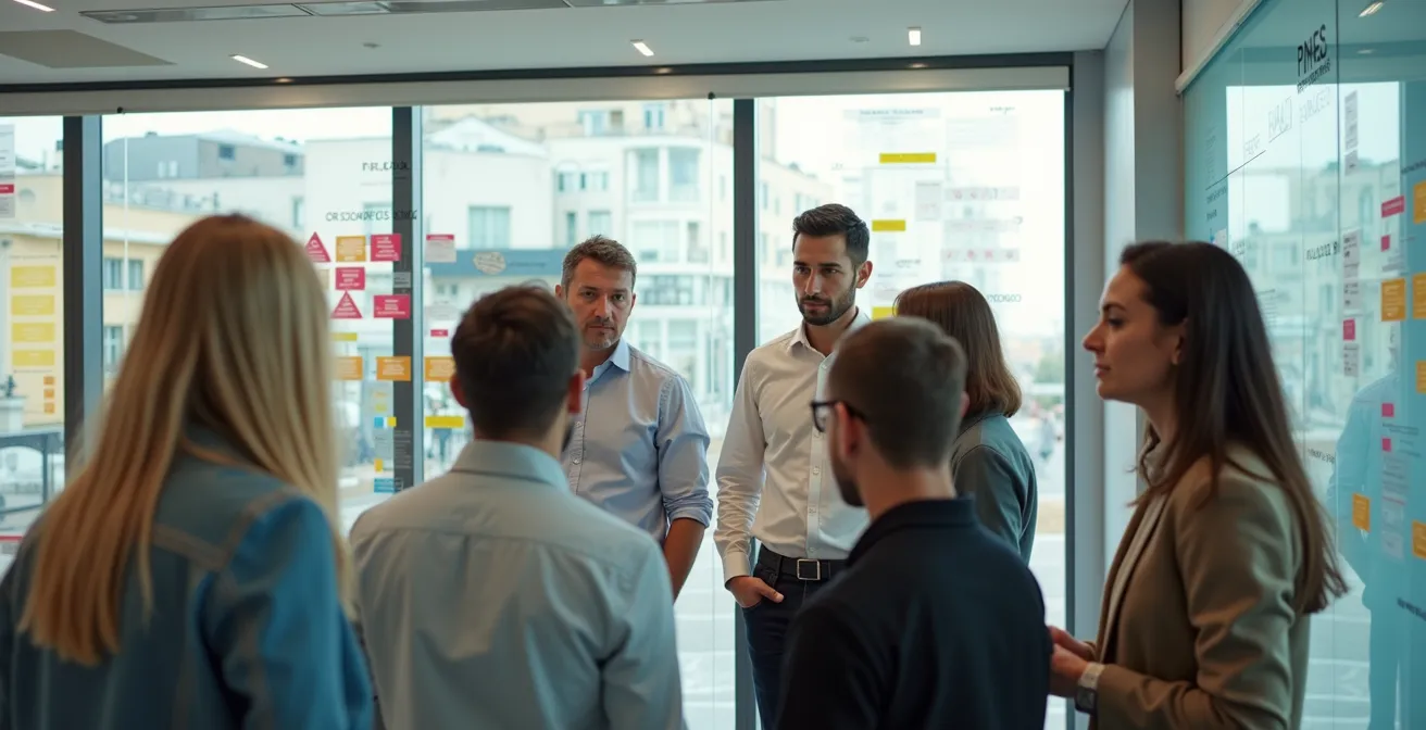 Una sesión de análisis colaborativo, como la que se intuye en la imagen, debe centrarse en los procesos y las lecciones aprendidas, no en las personas. Es el pilar de una cultura de mejora continua y seguridad psicológica.
